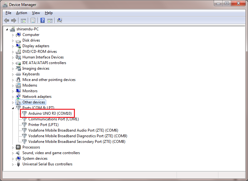 ให้ไปที่ Start menu และเปิด Control Panel ขึ้นมา ไปที่ Device manager จากนั้นดูที่ COM&LPT จะพบว่ามีชื่อ Arduino XXX (COMxx) อยู่