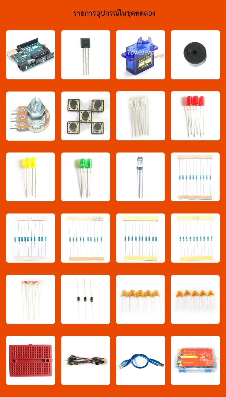Arduino Basic Kit ชุดนี้ใช้บอร์ด Arduino UNO R3 ของแท้ แต่เป็นเวอร์ชั่นสำหรับคนจีน (chinese version) โดยมีอุปกรณ์ในชุดทั้งหมด 24 ชิ้น