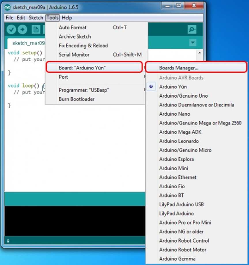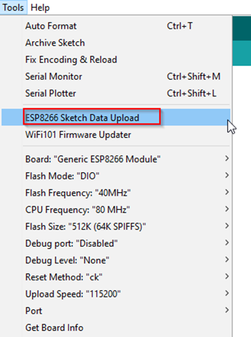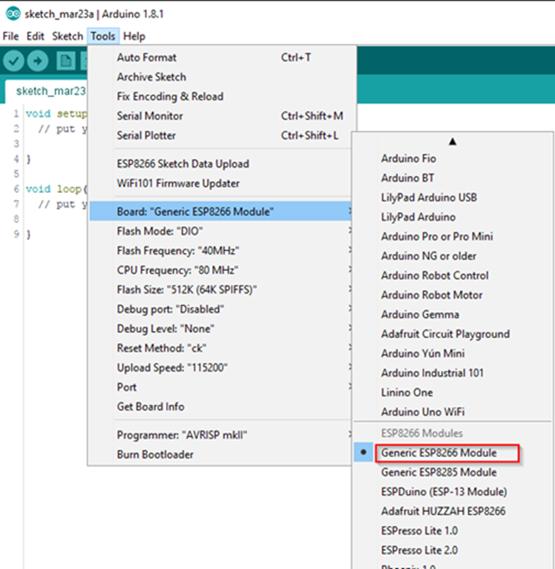 After installation, close the window and go to Tools> Board and see the list of available devices on the chip programming ESP8266. Next, you need to select the card as shown in the picture (Generic ESP8266 module)