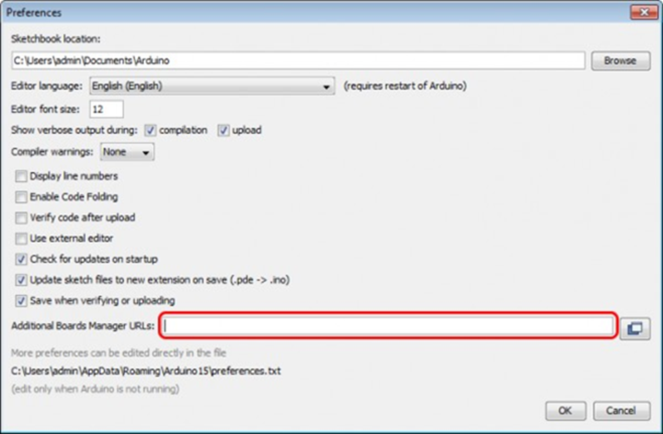 Then in the window that appears in the row Additional Boards Manager URLs (marked in red) insert the below link