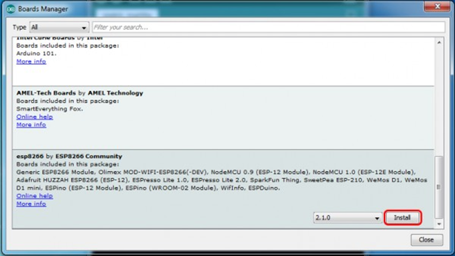 In the window that appears, scroll through the list down to the script esp8266 by ESP8266 Community and click.