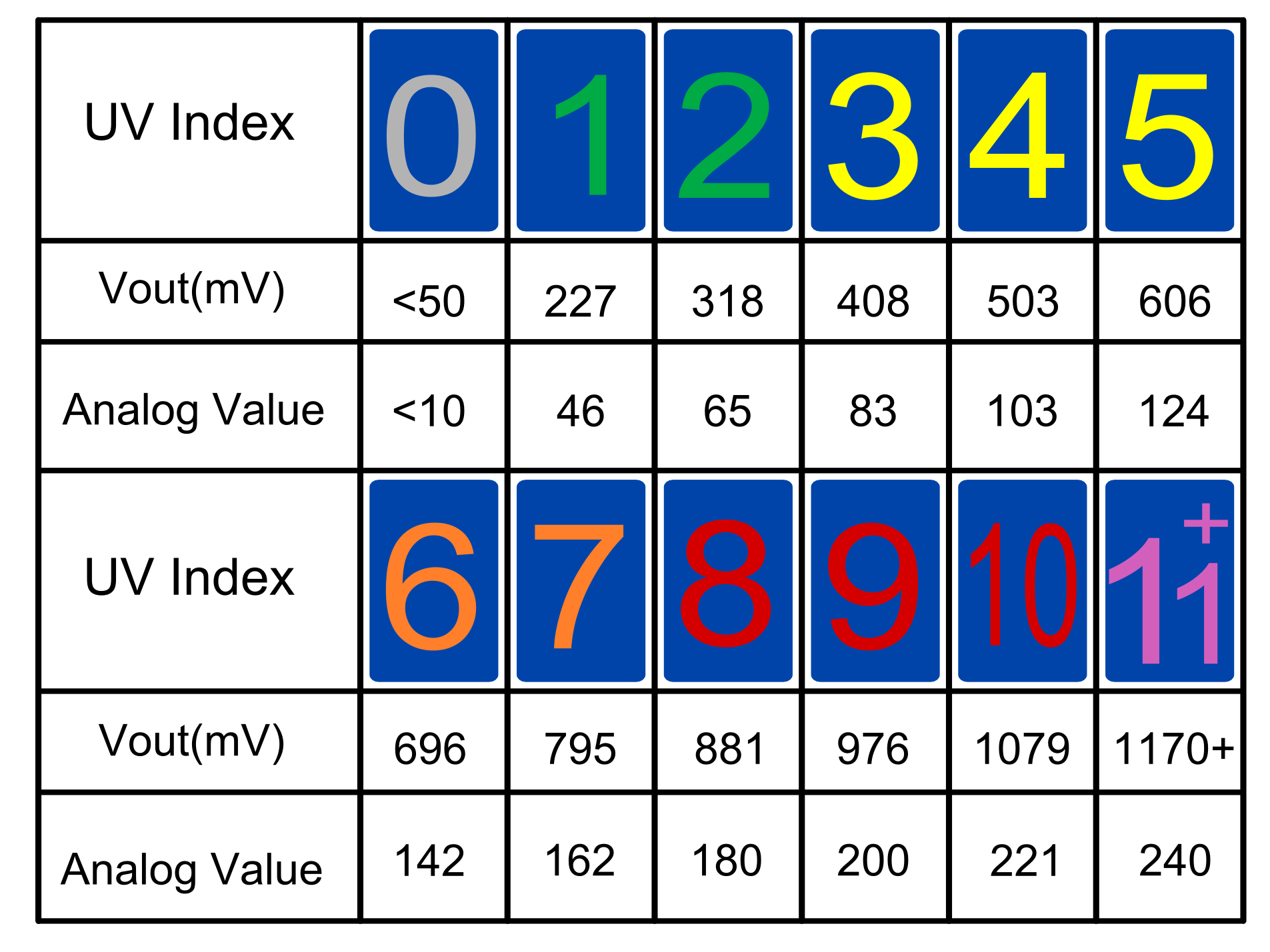 ใช้ต่อขา analog ของ Arduino แล้วอ่านค่ามาเป็นแบบ analog แล้วนำค่า โวลต์ที่อ่านได้มาเปรียบเทียบกับตาราง UV-INDEX
