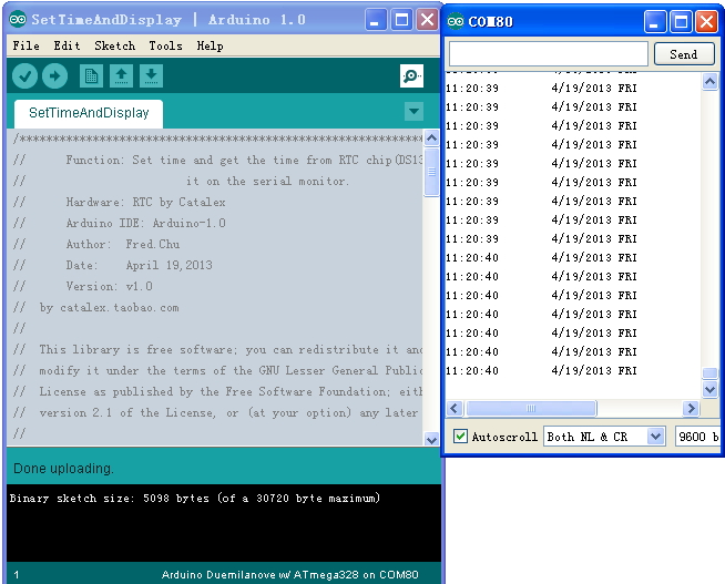 Seleced serial port, board name, click on the Burn button to burn. The routine shows you how to set the time, read time from the DS1307 and display to the display window serial tool, as shown below