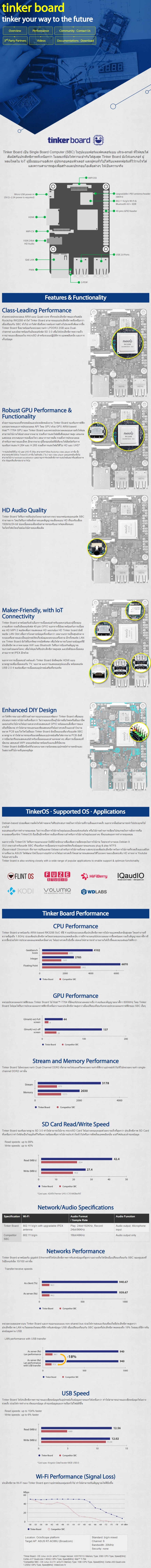 Tinker Board เป็น Single Board Computer (SBC) ในรูปแบบฟอร์มแฟคเตอร์แบบ ultra-small ที่ให้คุณได้สัมผัสกับประสิทธิภาพที่เหนือกว่า ในขณะที่ยังให้ความเข้ากันได้สูงสุด Tinker Board ยังให้เมกเกอร์ ผู้หลงใหลใน IoT ผู้ชื่นชอบงานอดิเรก ผู้ประกอบคอมพิวเตอร์ และผู้คนทั่วไปได้รับแพลทฟอร์มที่ไว้วางใจได้และความสามารถสูงเพื่อสร้างและประกอบไอเดียต่างๆ ให้เป็นความจริง