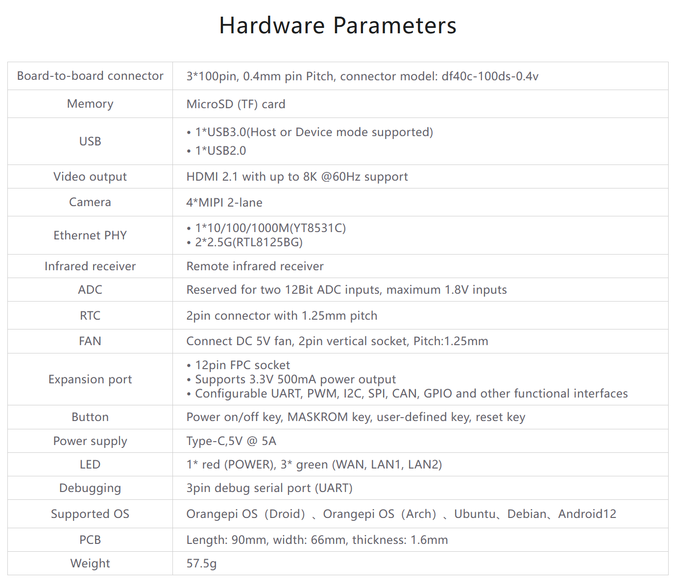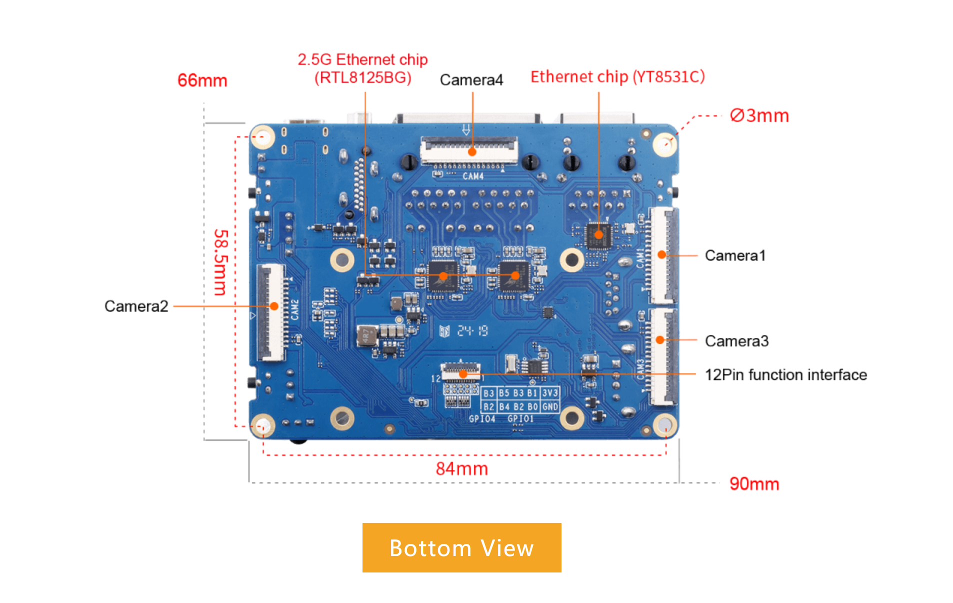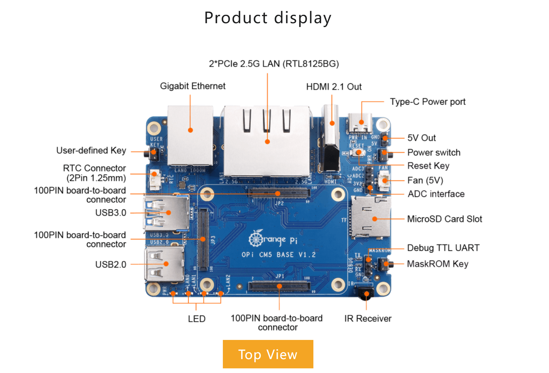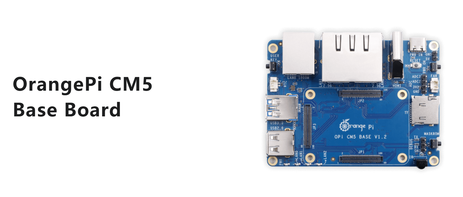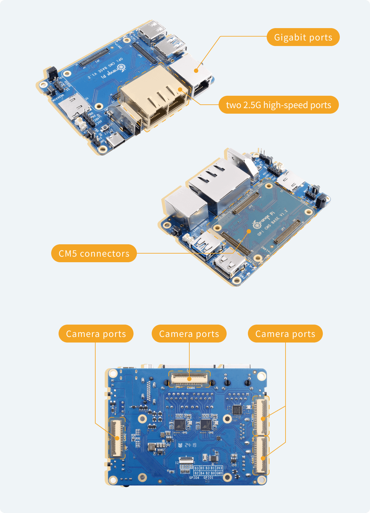 OrangePi CM5 base board is an official OrangePi base board that can be used with Orange Pi CM5 core board. It has two 2.5G high-speed LAN ports, one Gigabit LAN port, four camera ports, and standard CM5 connectors, and can be used as a CM5 development system as well as embedded boards to be integrated into end-products.