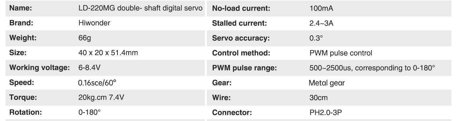 | Torque | 20 kg·cm (277.6 oz·in) @7.4V |
