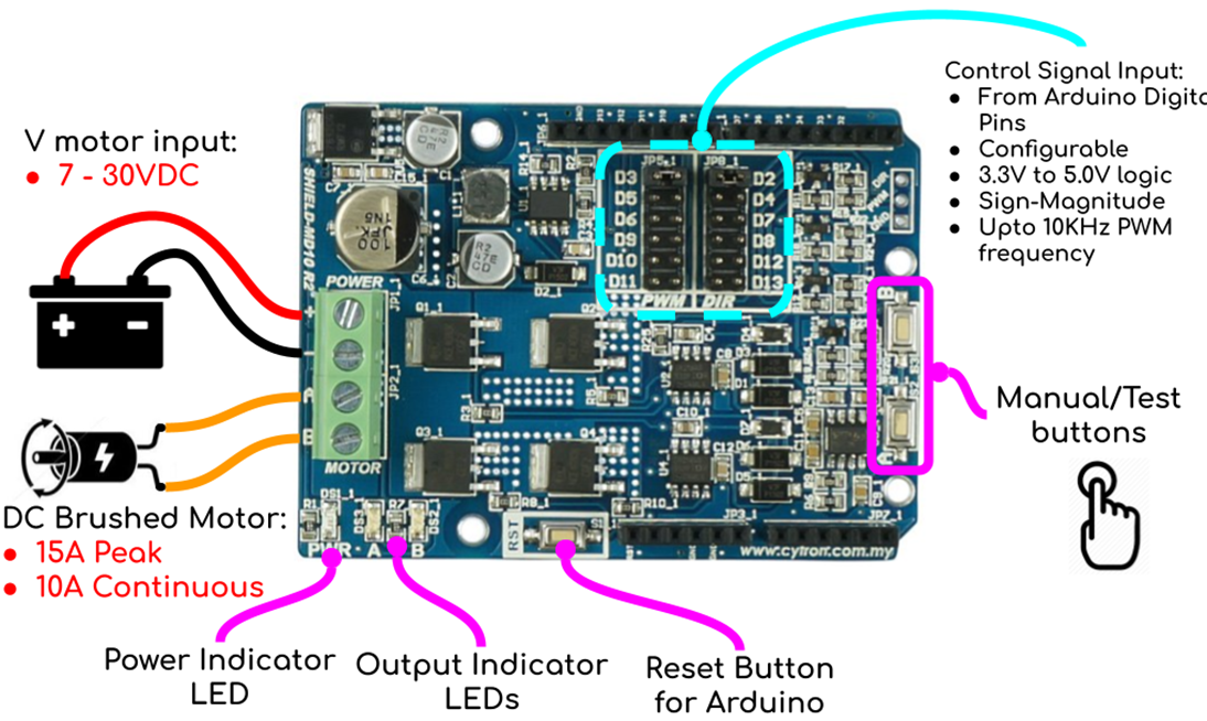 10Amp 7V-30V DC Motor Driver Shield for Arduino is a compatible Arduino motor shield for controlling high current brushed DC motor up to 10A continuously. It should be stacked on to an Arduino main controller board such as Arduino UNO R3.